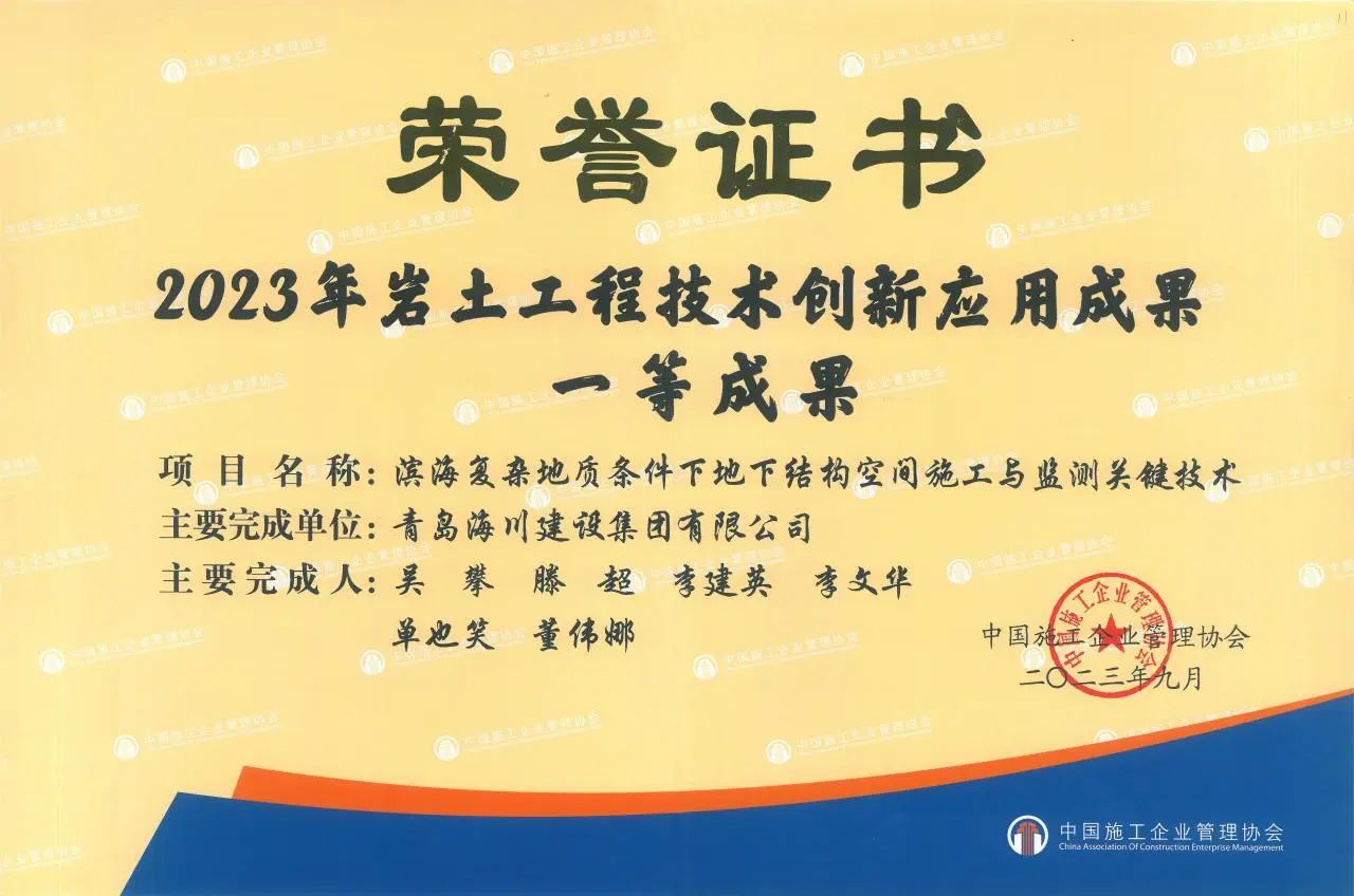 創(chuàng)新賦能 科技爭(zhēng)先 | 青島海川建設(shè)集團(tuán)榮獲多項(xiàng)科技成果獎(jiǎng)勵(lì)2023-10-08近日,中國(guó)施工企業(yè)管理協(xié)會(huì)公布了2023年度巖土工程技術(shù)創(chuàng)新應(yīng)用成果的通知,青島海川建設(shè)集團(tuán)研究課題《濱海復(fù)雜地質(zhì)條件下地下結(jié)構(gòu)空間施工與監(jiān)測(cè)關(guān)鍵技術(shù)》榮獲一等成果,該成果為集團(tuán)公司首次獲此殊榮,也是本年度青島市唯一一等獎(jiǎng)獲獎(jiǎng)獎(jiǎng)項(xiàng)。近年來,海川建設(shè)始終堅(jiān)持以科技為本,以... -
