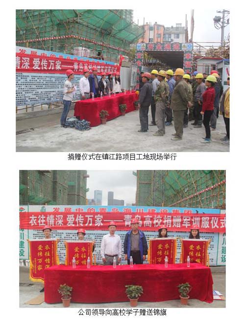 來(lái)自青島理工大學(xué)市北校區(qū)的學(xué)生會(huì)主席劉貞濤主持了捐贈(zèng)儀式,在主持人做過(guò)簡(jiǎn)單介紹后,儀式正式開(kāi)始,首先由海川集團(tuán)副總裁李尊強(qiáng)致歡迎詞,李總在致辭中說(shuō):農(nóng)民工兄弟為城市的建設(shè)做出了巨大的貢獻(xiàn),廣受社會(huì)關(guān)注。在海川集團(tuán)工地民工今天得到了本市三所高校學(xué)子們的深情關(guān)注,同學(xué)們的善舉不僅讓軍訓(xùn)服有了再利用的機(jī)會(huì),更是為農(nóng)民工朋友送上了溫暖和關(guān)懷,以點(diǎn)滴愛(ài)心促進(jìn)了社會(huì)和諧,在此向各高校組織表示感謝。緊接著,學(xué)生代表發(fā)言,向大家介紹了此次活動(dòng)的參與方及主要活動(dòng)經(jīng)過(guò),讓企業(yè)領(lǐng)導(dǎo)及工友代表對(duì)此活動(dòng)有了更深入的了解。接下來(lái),學(xué)生代表向工友代表分發(fā)軍訓(xùn)服、企業(yè)領(lǐng)導(dǎo)贈(zèng)予學(xué)生代表錦旗兩個(gè)環(huán)節(jié)均按計(jì)劃順利進(jìn)行。
