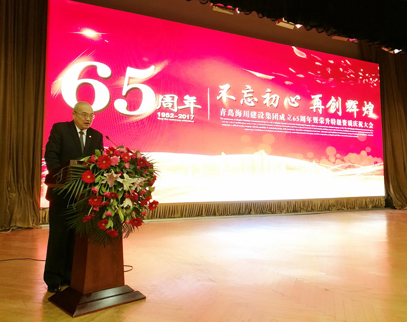 2017年12月29日上午,青島海川建設(shè)集團(tuán)成立65周年暨榮升特級資質(zhì)慶祝大會在黃海飯店隆重舉行。蒞臨現(xiàn)場的嘉賓有:原二建公司經(jīng)理陳樹業(yè)、原二建公司經(jīng)理國常光、原二建公司經(jīng)理鄭同慶,青島建設(shè)集團(tuán)建興工程有限公司董事長逄振輝、青建隆泰興業(yè)建設(shè)有限公司總經(jīng)理趙錫業(yè)、青島建設(shè)裝飾集團(tuán)有限公司董事長張波等領(lǐng)導(dǎo)。海川建設(shè)集團(tuán)董事長吳鑫、總裁仇建軍和公司股東、理事會成員、企業(yè)中層管理人員200余人參加,共同見證海川建設(shè)集團(tuán)在改革奮進(jìn)歷程當(dāng)中砥礪前行的輝煌成果。